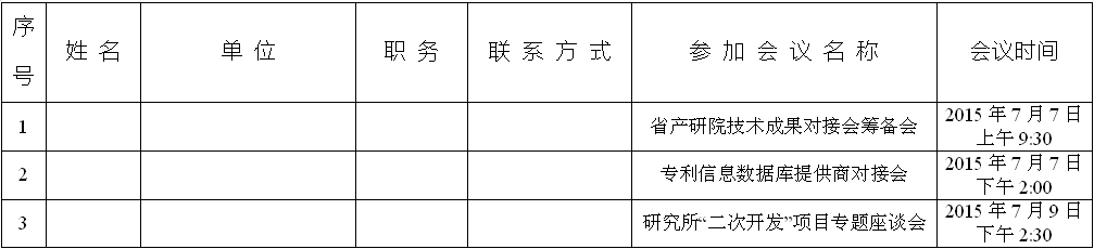 7月7日下午2点,在省知识产权局(南京市中山北路49号机械大厦)2008会议室,召开专利信息数据库提供商与专业研究所对接会。届时请首批建设专利信息数据库的研究所(名单见后)派相关工作人员(1-2名)参会,并于7月6日12点前将参会人员名单报技术转移部。联系人,金靖,025-83455147、13913993169,email:ttd@jitri.org。