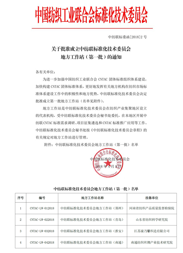 2018年4月8日,中纺联标准化技术委员会公布了首批地方工作站名单,九游在线官网j9等四家单位成功获批。
