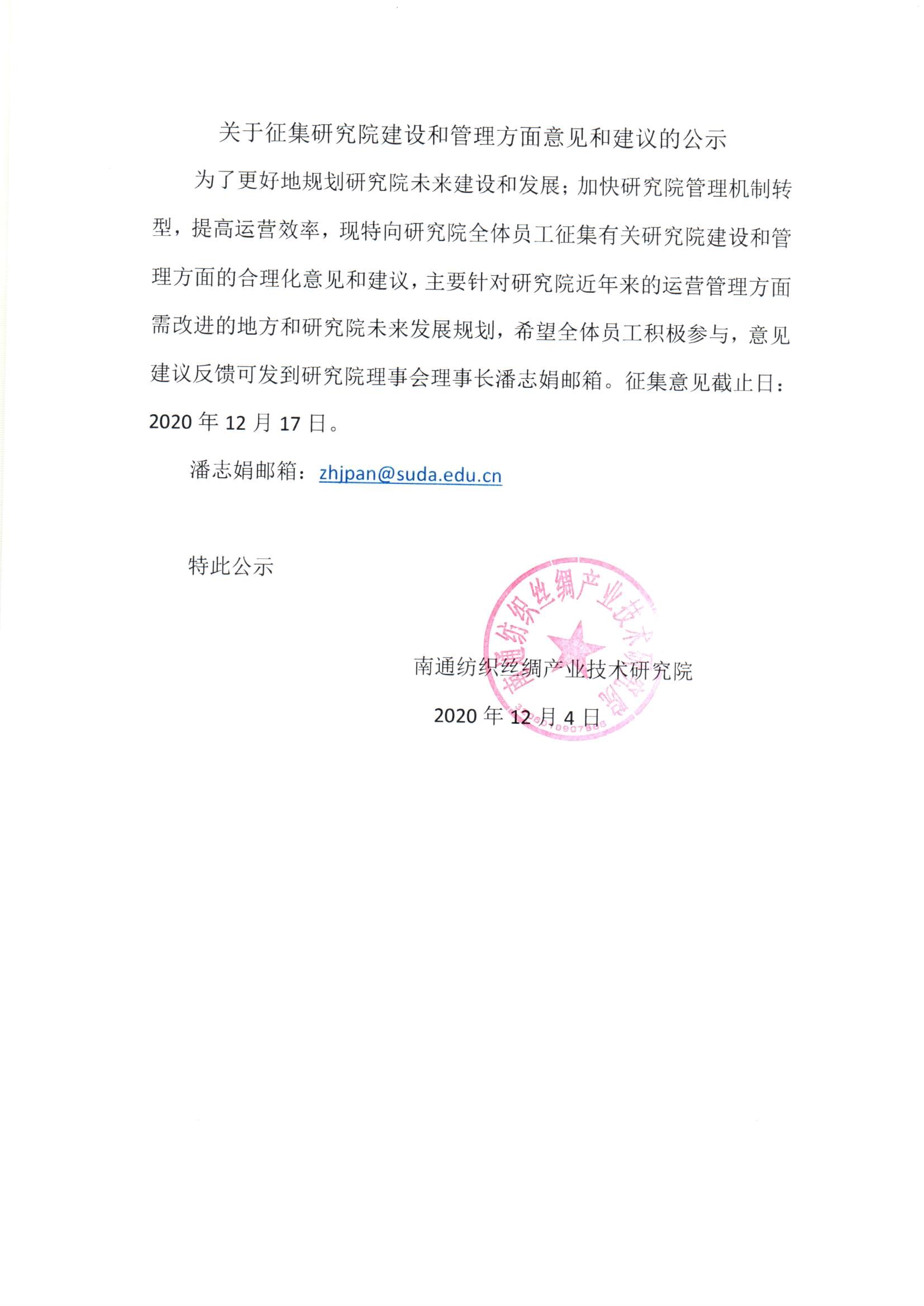 关于征集研究院建设和管理方面意见和建议的公示